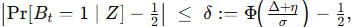 Reason. Worst case is ∣μt∣=Δ and Wt=±η; with Qt∼N(0,σ2), this is exact.